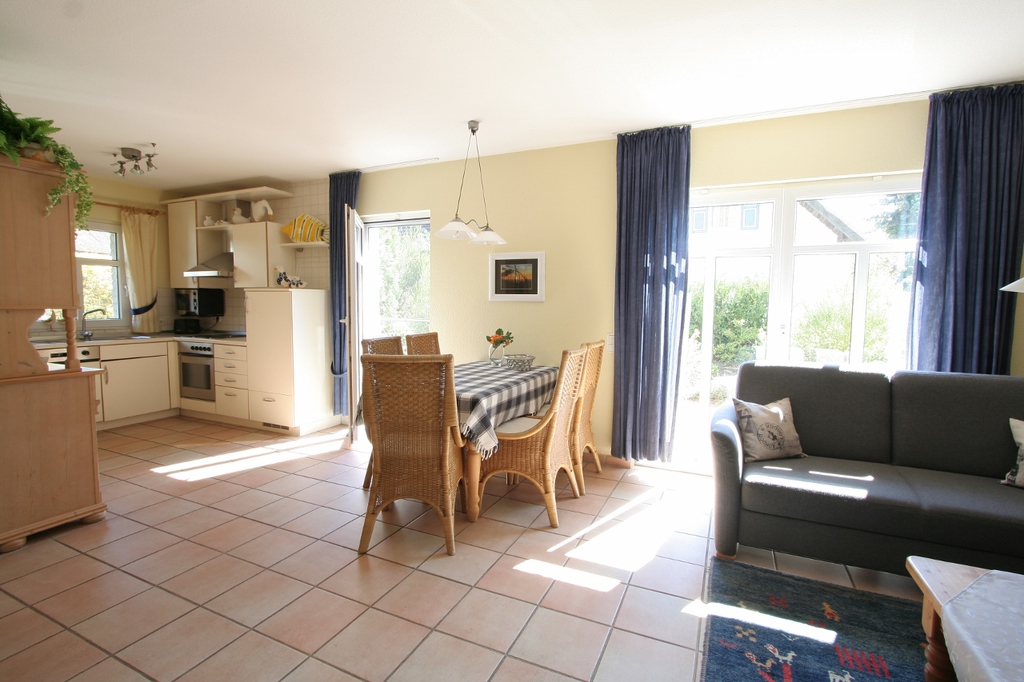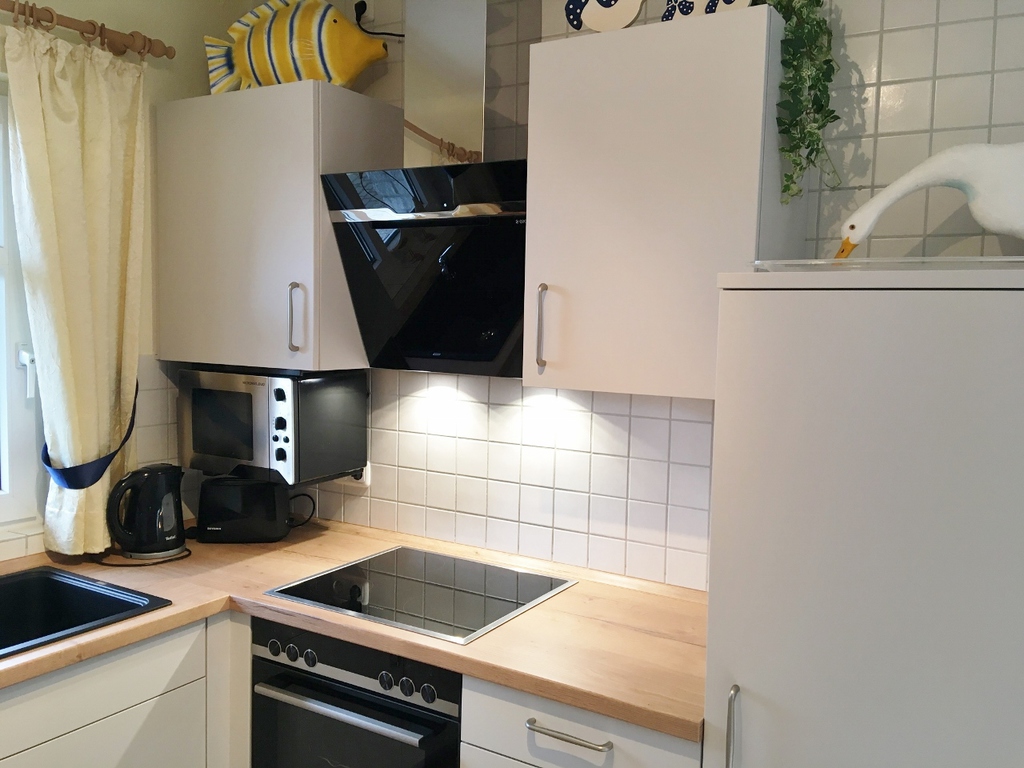 offene Küche: großer Esstisch, Geschirrspüler, Ceranfeld & Backofen, Kühlschrank (+Gefrierfach),