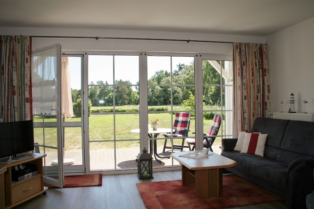 sonniger Terrasse mit traumhaftem Blick zum Darßwald.