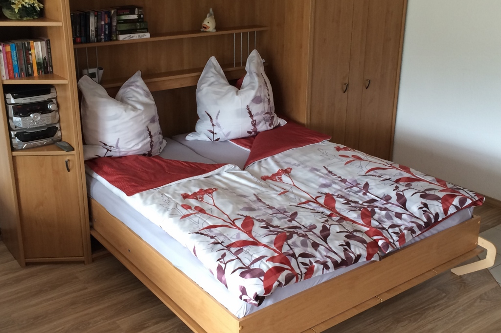 Schlafbereich: Klappbett mit Lattenrost und Federkernmatratzen/ 160 x 200/ Kleiderschrank