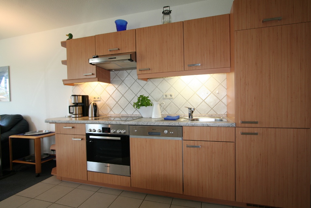 Kühlschrank mit Gefrierfach, Ceranfeld, Backofen, Geschirrspüler, Wasserkocher, Kaffeemaschine,