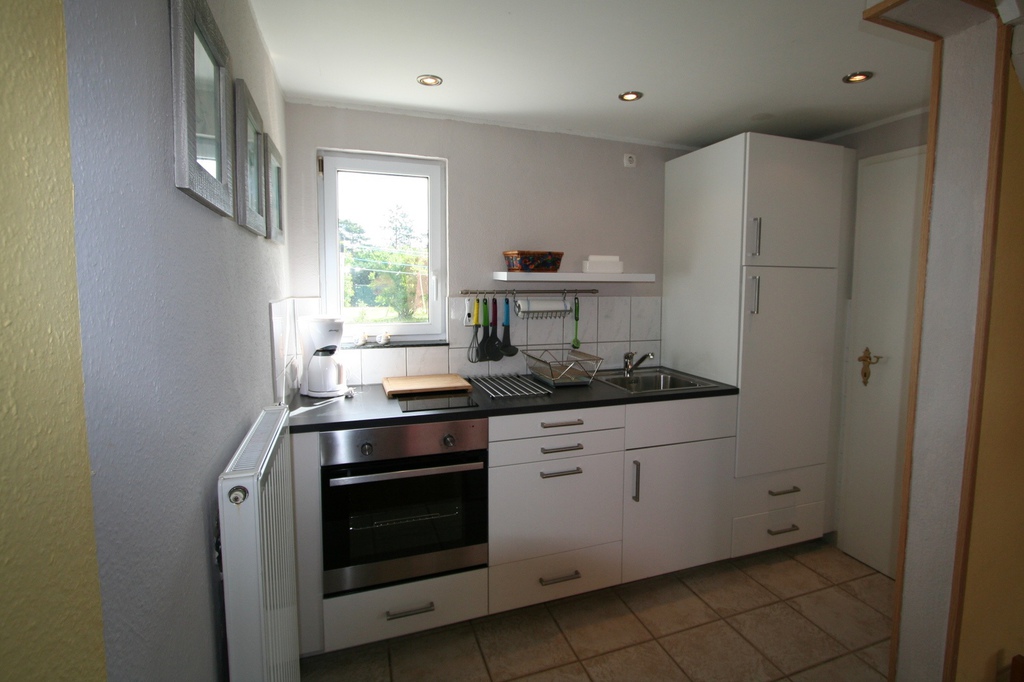 Küche: Ceranfeld mit Backofen, Kühlschrank (+Gefrierfach), Kaffeemaschine, Wasserkocher