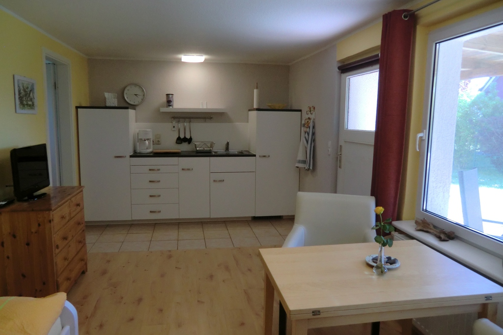 Küchenzeile: kleiner Esstisch, kleines Ceranfeld, Kühlschrank (+Gefrierfach),